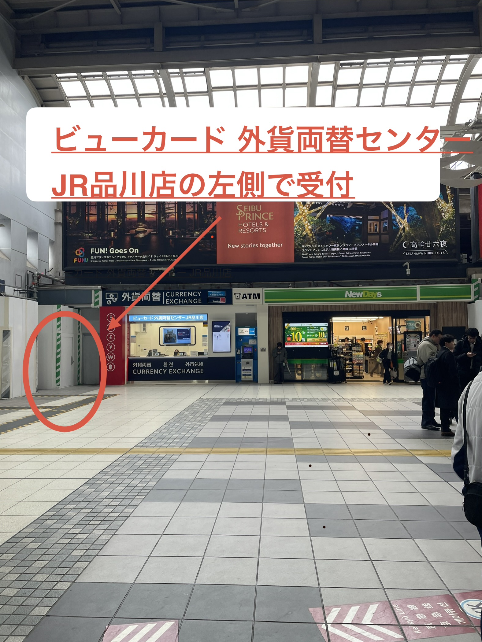 品川駅 中央改札口 ビューカード 外貨両替センター JR品川店左側で受付(写真にてご確認下さい)改札を出た正面、NewDaysの左側になります。